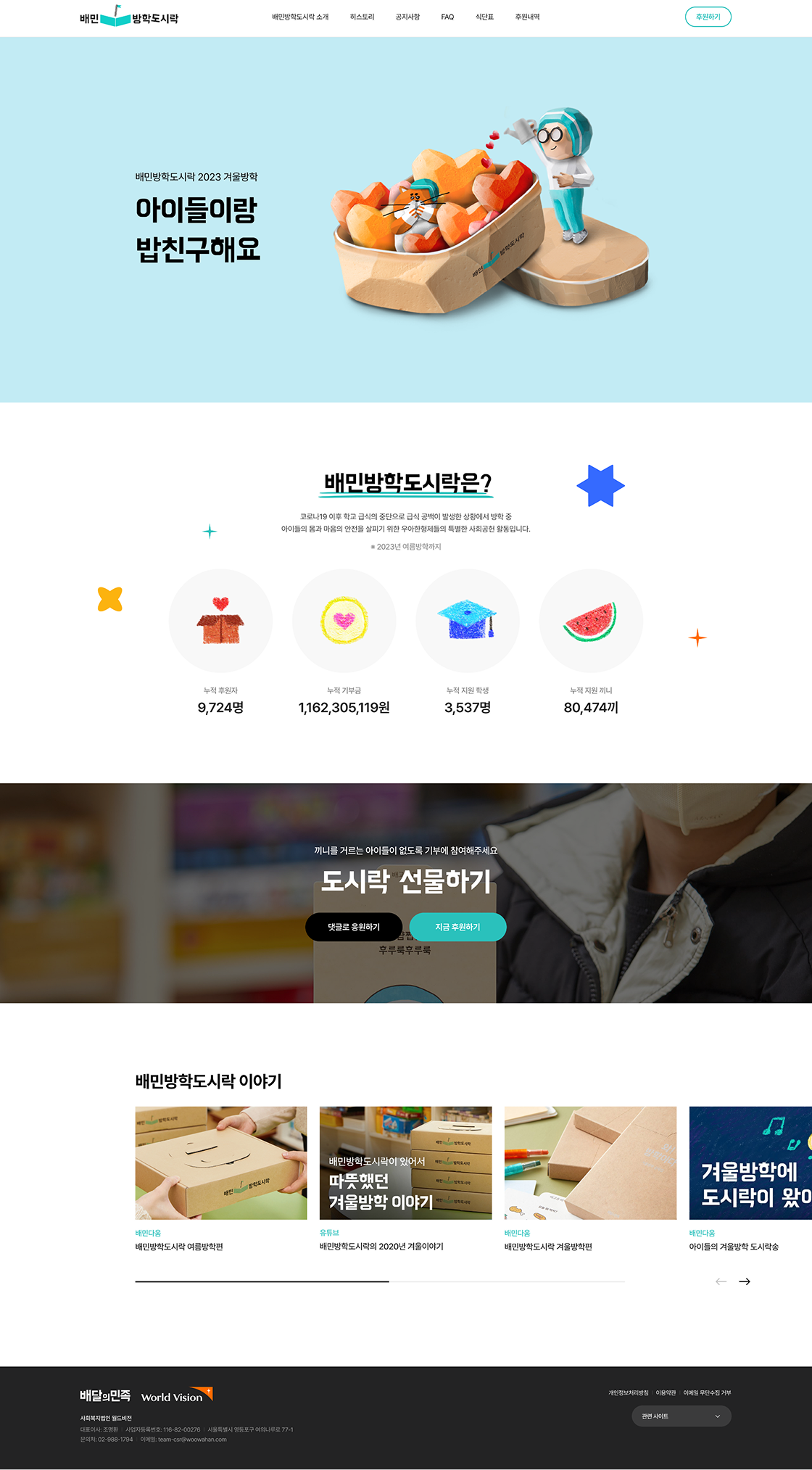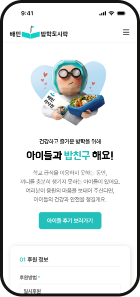 배민방학도시락은 후원자들의 참여로 운영되며, '밥친구'가 되어 아동들의 건강한 방학을 지원할 수 있습니다. 홈페이지를 통하여 후원이 가능합니다.