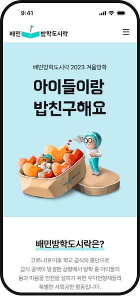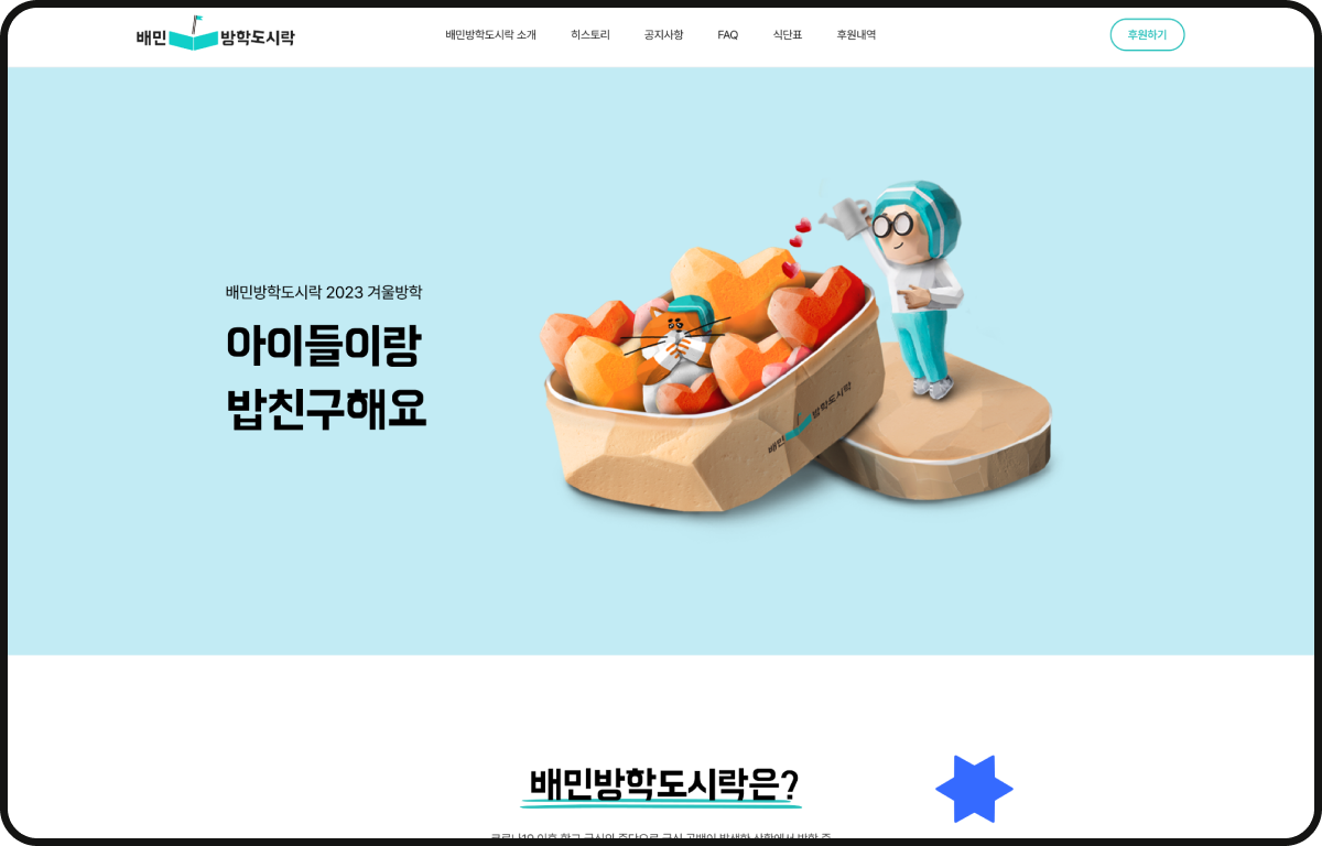 배민방학도시락은 우아한형제들이 2020년부터 진행해온 사회 공헌 프로젝트로, 방학 동안 급식이 중단되어 끼니를 해결하기 어려운 아동들에게 도시락과 배민 식사권을 제공하여 건강한 식사를 지원하는 프로그램입니다.